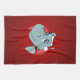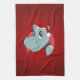 Kitchen towel with an illustration of a cute happy hippopotamus with a red and white Santa Claus hat; Christmas holidays design for kids, on a red background