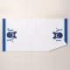 This bath towel set is shown on a white background with Royal Blue borders and text with a blue ornament with a bow in the center of the word joy on all items at each end, except the wash cloth is in one corner only.