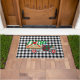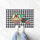 This Christmas holiday doormat is shown with a country style black and white gingham plaid print with a festive car art print.