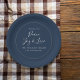 This design features Christmas holiday modern simple elegant, traditional winter minimalist navy blue, chic minimal calligraphy script font, modern hand-lettering script font, classic family name contemporary, whimsical typography template, with elegant flourish vintage pattern, peace joy and love saying, a holiday Christmas party dinner dessert paper plate