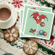 A cute red dragon in a martini glass holding a green olive. Ornaments, green olives and a present all around.