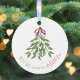 Cute Merry Mistletoe Holiday Christmas Photo Ornament. Personalized with a custom name. A trendy cute holiday Christmas gift. A wonderful way to celebrate the holidays. This design features Christmas holiday merry cute mistletoe, modern elegant green, and red, photo simple minimalist basic, classic traditional holiday greenery, botanical green leaves foliage, with watercolor red ribbon, modern and minimal holiday, artwork by laura Lacina, a holiday Christmas photo ornament, cute calligraphy script typography font