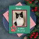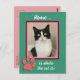 This new address postcard features your cat or cats in a rose and candy cane red frame on a spearmint colored background with a giant rose colored paw print on the bottom left of the frame. The word "Home ..." appears above the cat and below are the words "is where the cat is!" On the back of this postcard, you can customize your new address and your holiday closing. This is a great way for a cat lover to announce a move during the holidays. Copyright peachesthetuxedocat