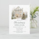 Festive Christmas party invitation featuring a beautiful house with Christmas trees, snow, fairy lights and garlands. Perfect for an Open House Party. The words can be changed to suit your own details or requirements
