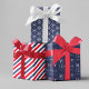 This design features Christmas holiday navy blue festive, Christmas holiday snowflake pattern, simple minimal festive minimal, navy blue red nautical colors, modern calligraphy script font, trendy stylish typography text, family name from custom customize, Christmas holiday gift wrap, Christmas holiday gift wrapping supplies, classic traditional holiday winter, coastal nautical Christmas paper