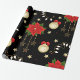 A roll of wrapping paper with a black background, decorated with a repeating pattern of Christmas-themed elements. The pattern includes red poinsettias with green leaves, golden Christmas ornaments adorned with red bows and snowflake designs, strings of lights with white bulbs, and golden stars of various sizes. Small red star-shaped dots are scattered throughout the background, adding to the festive look. The wrapping paper is partially unrolled, revealing the pattern and the rolled edge.