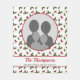 Destei's original festive pattern of green and red Christmas Holly / Common Holly plants together with red bows. Over the pattern there is a round photo template that is framed by a red border. There are also two personalizable text areas.