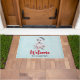 A welcome doormat with a whimsical and cute watercolor painting of a husky dog wearing a blue Santa hat.