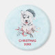 A magnet with a whimsical and cute watercolor painting of a husky dog wearing a blue Santa hat.