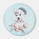 A magnet with a whimsical and cute watercolor painting of a husky dog wearing a blue Santa hat.
