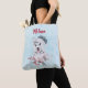 A tote bag with a whimsical and cute watercolor painting of a husky dog wearing a blue Santa hat.