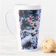 Sparrows and a pigeon by the bird feeder in wintertime. Snow-covered Christmas trees decorated with red, blue balls around. Christmas idyll. One-of-a-kind, beautiful latte mug. You can transfer this design to a large variety of other products, just choose a product from a line hereinunder. Have fun and be happy!