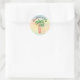 These stickers are decorated with a fun watercolor of palm trees decorated like Christmas Trees on a colorful background.