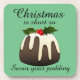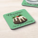 Christmas coasters with cork back and slogan "Christmas is short so savor your pudding!" with image of Christmas pudding decorated with holly.