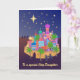 A joyful Christmas card for a special Step Daughter, with a starry sky, the three wise men on their camels in the distance, and Joseph, Mary and a donkey making their way into the brightly coloured little town of Bethlehem. The lettering, Christmas Joy, and stars are in gold-effect paint (not gold foil). A mixed-media design by Judy Adamson.