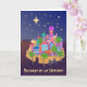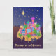 A joyful Christmas card with the greeting, Alegria de la Navidad ('Christmas Joy' in Spanish), with a starry sky, the three wise men on their camels in the distance, and Joseph, Mary and a donkey making their way into the brightly coloured little town of Bethlehem. The lettering, Christmas Joy, and stars are in gold-effect paint (not gold foil). A mixed-media design by Judy Adamson.
