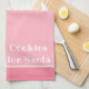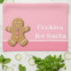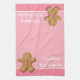 This holiday season, hang this adorable Christmas kitchen towel with a tasty-looking gingerbread man over a two tone pink background with white accent stripes and text which reads "Cookies for Santa".