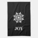 This kitchen towel is shown with a classic Christmas print of a large snowflake with text of JOY.