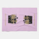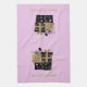 This kitchen towel is shown in custom warm orchid purple with a short stack of black and gold colored Christmas packages along with matte gold colored text of Merry Christmas.