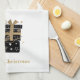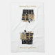 This kitchen towel is shown in white with a short stack of black and gold colored Christmas packages along with matte gold colored text of Merry Christmas.