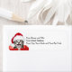 Silver or gray tabby kitten in a Christmas gift box wearing a Santa hat sends wishes of a Merry Christmas photo holiday return address label