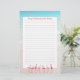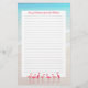 Lined, blank paper with a beach and tropical theme and flamingoes design. Created as a Christmas letter to write family updates to share at the holidays, the paper's background image is a beach with tropical blue water. A row of pink birds decorates the bottom and the same beach scene is on the reverse. Personalize pink text along the top to hold a greeting and family name, or whatever you need.