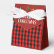 Colorful string of holiday Christmas lights with red and black lumberjack plaid for gift favors.