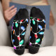 This fun Halloween socks are bright and colorful. The small print is crisp and shows the fun details. The softness of the socks feels nice on my feet and ankles. .