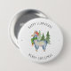 This cute Christmas holiday button features a trendy, watercolor llama in a Santa hat and green winter scarf, standing in front of green pine trees. The funny text says "happy llamadays."