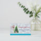 Holiday greetings business card with a funny illustration. A cute llama wearing black sunglasses and a red santa hat. Standing behind a Christmas tree with festive presents. The word Joy written above his head in a colorful holiday font. Silver bokeh background. Whimsical and fun Christmas themed design.