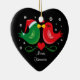 Two Christmas love birds wishing everyone a very Merry Christmas featuring two lovebirds kissing, snowflakes and hearts. The male bird is wearing a Santa hat. The female bird has pretty eyelashes. Customize it with your own greeting or message. Great for Christmas weddings, a first Christmas and anniversaries. PinkInkArt original!