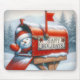 A cheerful snowman peeks out of a red mailbox adorned with a "Happy Holidays" sign, surrounded by a snowy landscape