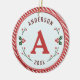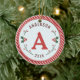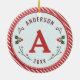 Vintage designed Christmas monogrammed ornament. Designed with red and green colors set against a light blue diagonal striped background. Surrounded by beautifully designed holly. Customize with your name, initial and year.