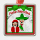 A graphic illustration of Mexican Christmas Caroler Couple with flowing music and the text “Feliz Navidad" on a premium ornament. Original artwork: Copyright Charmaine Paulson