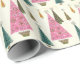 Christmas wrapping paper with angular, abstract Christmas trees in pink, green and gold.