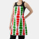 This Christmas apron has a mid-century modern design of red and green rounded rectangles in increasing and decreasing size running vertically on a field of white.