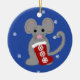 A cute Christmas mouse holding a red Christmas stocking on a blue background with little white snowflakes...