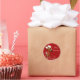 Cute cartoon mouse with a Santa hat on holding a present behind his back. A deep red background with white snow features makes for a very cute, fun and festive Christmas greeting gift tag sticker design.