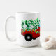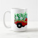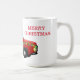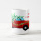 Christmas holiday ceramic coffee mug is shown with a festive holiday red truck print with Merry Christmas text.