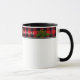 Ceramic coffee mug is shown with a Christmas holiday red and black buffalo plaid evergreen swag print design.