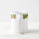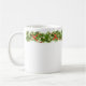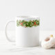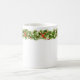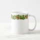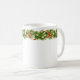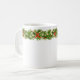 Christmas holiday ceramic coffee mug is shown with a festive holiday fir garland with mistletoe and red ribbons print.