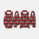 White NAUGHTY text with snowflakes and Santa Claus caps on red and black buffalo plaid background.
