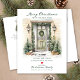 This festive moving announcement features the saying "Merry Christmas from Our New Home" with a beautiful watercolor light brown tan front door adorned with Christmas trees, pine garland and wreath. The announcement is perfect for sending to friends and family during the holiday season to let them know about your new address. The front of the announcement features the saying and watercolor front door, and includes your new address and contact information. The overall design is festive and inviting, and the announcement is sure to put a smile on the faces of your loved ones.