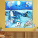 A teal and dark blue snowy star background with a snowman and a flying Santa on his sleigh, sending reindeer through the sky, creates a fantasy scene for a kiddies room.