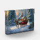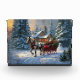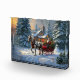 Santa driving a one-horse sleigh to deliver Christmas presents in a small town