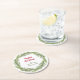 This corporate business supplies coaster says "Happy Holidays" in red script with your business name in green, surrounded by a hand drawn, watercolor illustration of an evergreen wreath. Perfect for your Christmas open house or any winter promotional event.