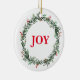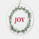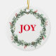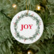 This Christmas ceramic ornament is shown with a festive holiday berry wreath print and text: JOY.