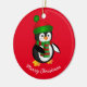 Christmas Ornament shown in a round shape with a red background and a cute holiday penguin print.