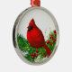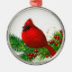 Christmas Ornament shown in a round shape and is made of silver tone metal with a holiday print design of a red cardinal bird.