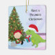 Christmas Ornament with a cute illustrated Dinosaurs handing a present to a child. The scene takes place in a pink and blue room, a Christmas Tree with faux glitter on it. All the words can be changed. Thanks to Apple Tart, Creative Fabrica and Pixabay for some of the elements in the design.